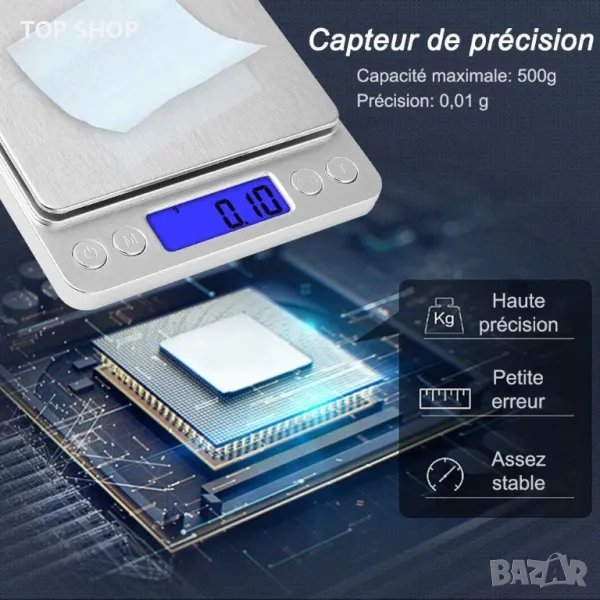Висока прецизност и широк диапазон- Сензорът за свръх висока точност може да постигне точна четливост от 0,01 g и ви позволява да претеглите максимален капацитет от 500 g. Той е много лесен за почистване и използване, прави го идеално за претегляне, като мая, скъпоценни бижута и диаманти, които изискват висока точност на претегляне.