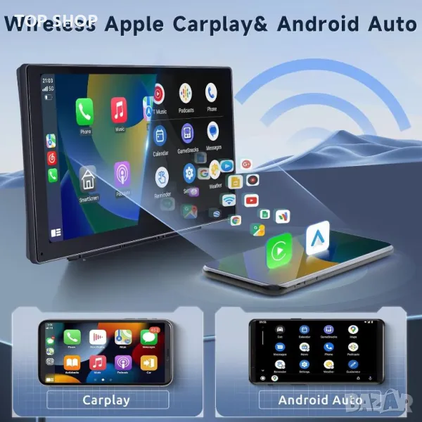 【Wirelsee Apple Carplay/Android Auto】Преносимата стерео уредба за кола поддържа безжични Apple Carplay и Android Auto. Просто се свържете с вашия смартфон чрез bluetooth. Можете безжично да управлявате навигация, съобщения, телефонни обаждания, музика, имейл, известия и др. Можете дори да свържете вашия асистент Siri, за да контролирате телефонни разговори, да навигирате, да възпроизвеждате музика, всичко това, за да можете да се съсредоточите върху пътя, да държите ръцете си свободни и да шофирате в пълна безопасност!