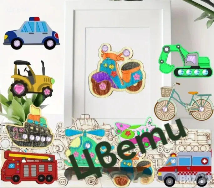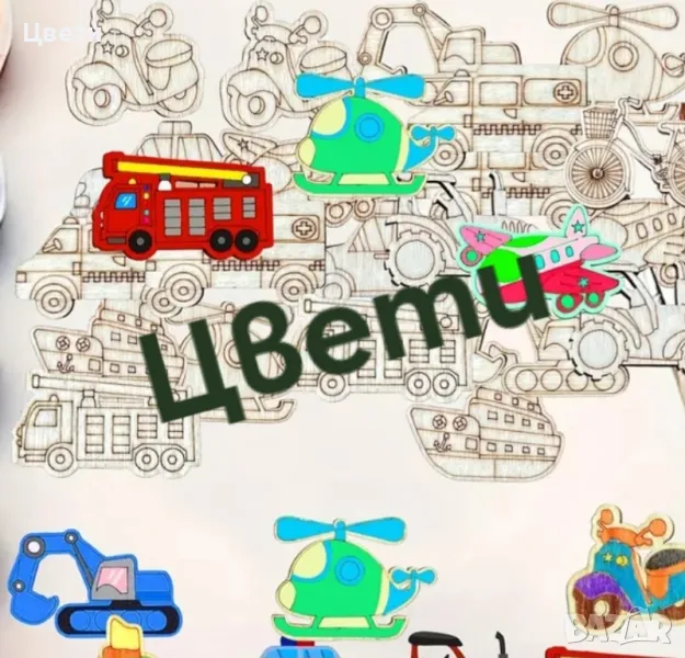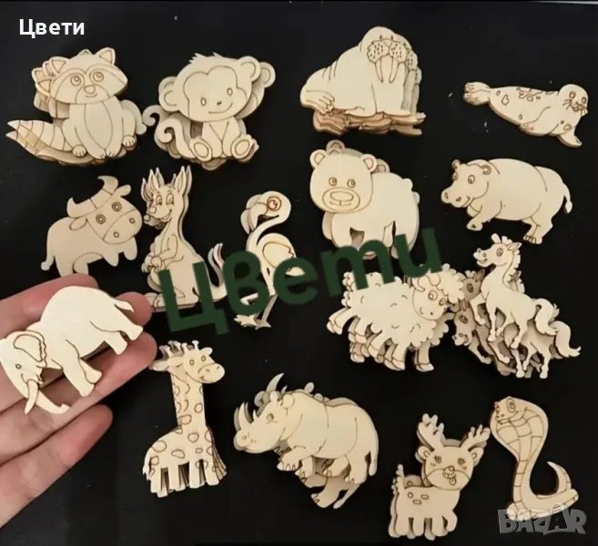 Дървени фигурки за оцветяване- котки, кучета, динозаври, превозни средства, диви и домашни животни.