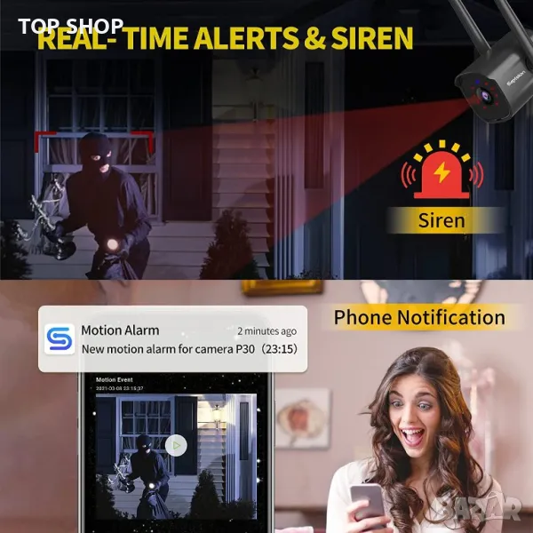 Alarm Siren & Multi-User Access】 Можете да настроите автоматичната сирена на камерата или да звучите на сирената в случай на спешност, за да изплашите незасегнатите гости. Споделете външната камера със семейството си (до 8 потребители), защитете дома си заедно. Поддържа RTSP, ONVIF и съвместим с Alexa.