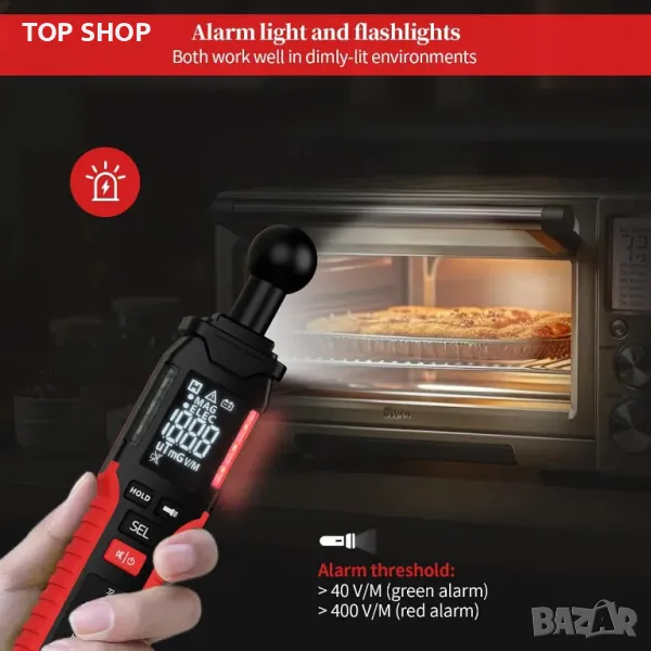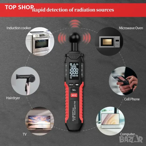 Преносим цифров EMF Meter с LCD дисплей, звуков сигнал и предупредителна светлина, подходящ за проверка в домове, офиси, на открито и компютърни зали и др.