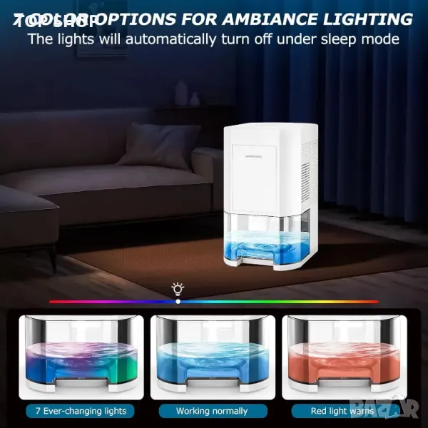 7 цветни атмосферни светлини - С вграден цветен индикатор във водния резервоар на нашия малък влагоуловител, като просто докоснете бутона за светлина на контролния панел, за да го включите, като цикълът по подразбиране стартира 7 цветни светлини вместо вас. Докоснете бутона отново, можете да заключите любимия си цвят. PS: всички светлини автоматично ще се изключат в режим на заспиване, за да ви осигурят удобна почивка.