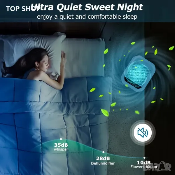Ултра тиха технология и два режима на работа - С ултра тихата технология Пелтие, електрическият влагоуловител BOOHENKA работи тихо с ниво на шум под 40 децибела и не ви безпокои в ежедневната ви работа и живот. Шумът е под 28dB, за да създаде комфорт среда, без да ви безпокои, докато спите или работите. Има режим на висока мощност и режим на заспиване. В режим на заспиване цялата светлина се изключва автоматично и шумът е под 28 dB.