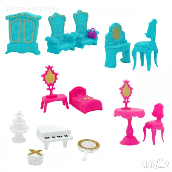 Комплектът се състои от красив розов сгъваем дворец и мебели, които перфектно пасват на елегантния декор. Фигурката на принцесата е с красива руса коса и вечерна рокля - със сигурност ще зарадва вашето дете!