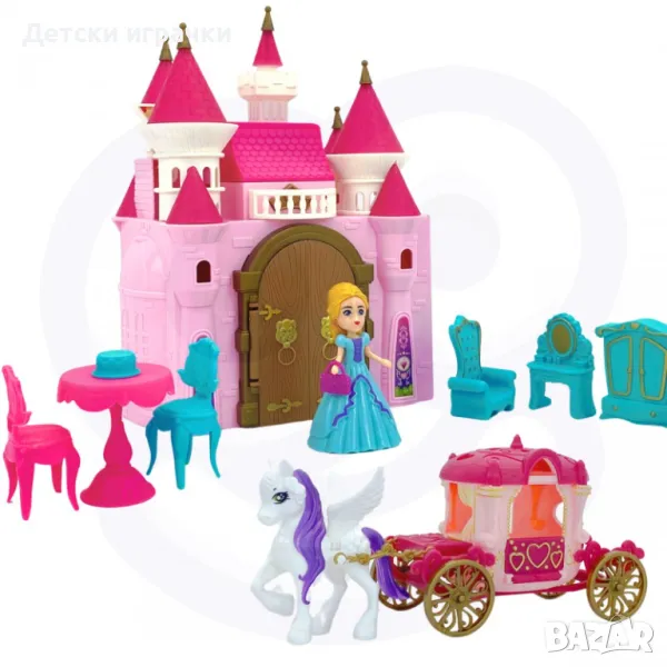 Комплектът включва и очарователен кон Пегас с прикрепена розова карета. Дворецът е интерактивен - има светлинна и мелодична функция.