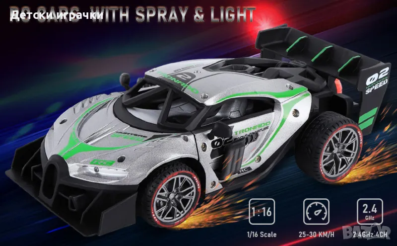 RC превозното средство достига скорост от приблизително 15 км/ч, в зависимост от дължината на пистата.