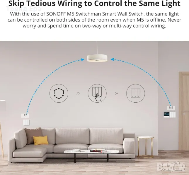 Използвайте R5 със SONOFF M5 Switchman Smart Wall Switch, една и съща светлина може да се управлява от двете страни на стаята, дори когато M5 е офлайн. Никога не се притеснявайте и не губете време за двупосочно или многопосочно контролно окабеляване. Можете да залепите R5 на стената като превключвател или да го свалите като дистанционно управление. Един eWeLink-Remote може да добави до 8 R5 дистанционни контролера!