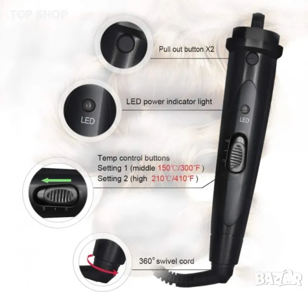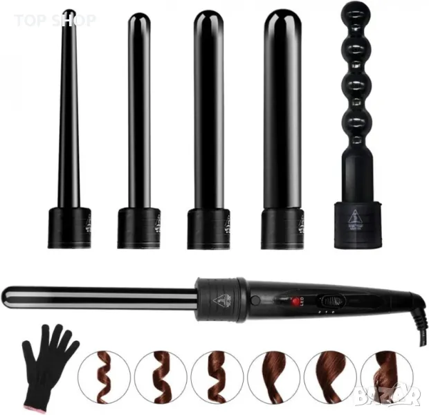 6 накрайника за къдрене с различни ефекти са: 9-18 мм, 19 мм, 19-25 мм, 25 мм, топка 25 мм, 32 мм, могат да произвеждат 6 различни къдрици с ефект, включително вълнообразни, пълни къдрици или малки стегнати къдрици и др.