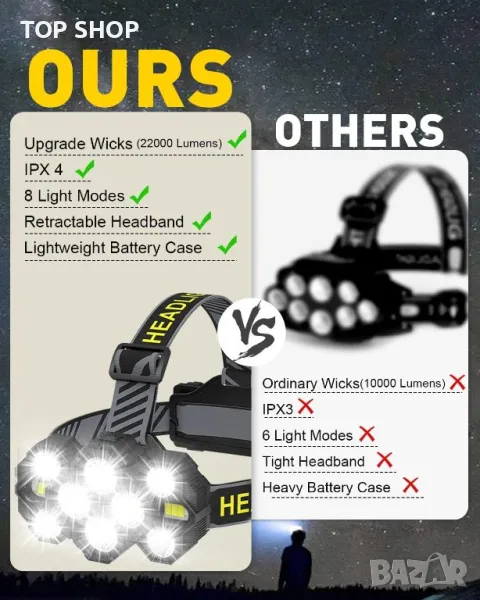 2023 СУПЕР ЯРЪК 10 LED И ДЪЛГОТРАЕН ФЕНЕР ЗА ЧЕЛНИК - 2023 Надстроена Висококачествена батерия поддържа 3 часа бързо зареждане, което осигурява 7-8 часа работа. Благодарение на усъвършенствания дизайн на LED крушки T6*4 + XPE*4+SMD*8, животът на батерията при пълно зареждане при всяка употреба е три пъти по-дълъг и по-ярък от нормалните фенери на пазара.