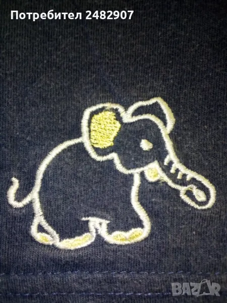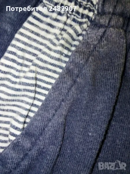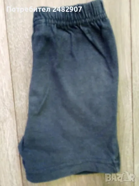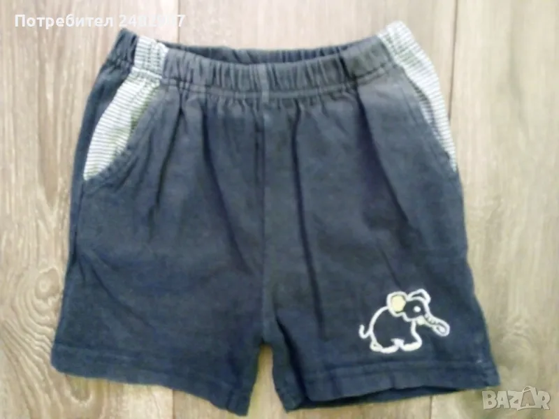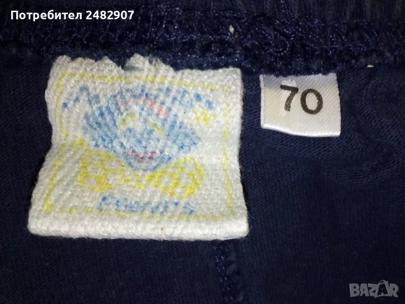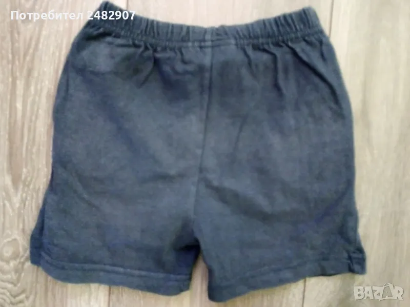 Къси детски панталонки в тъмно синьо за ръст - до 70 см. Съдържат 100 % памук. Ширина в талията - 21 см, дължина от талията до чатала - 20 см, дължина от талията до долу - 26 см, ширина на крачола в долната част - 16,5 см. Запазени, с нормални следи от износване, с два странични джоба.