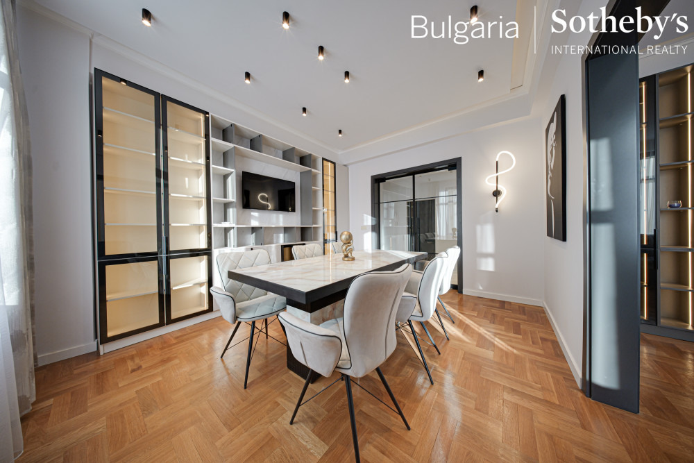 BULGARIA SOTHEBY S INTERNATIONAL REALTY представя на Вашето внимание модерен двустаен апартамент за продажба в самия център на столицата. Неповторимата атмосфера е постигната благодарение на високите тавани 3.20 м., гипсовите орнаменти, настилки от висококачествени естествени материали и отлични дизайнерски решения.