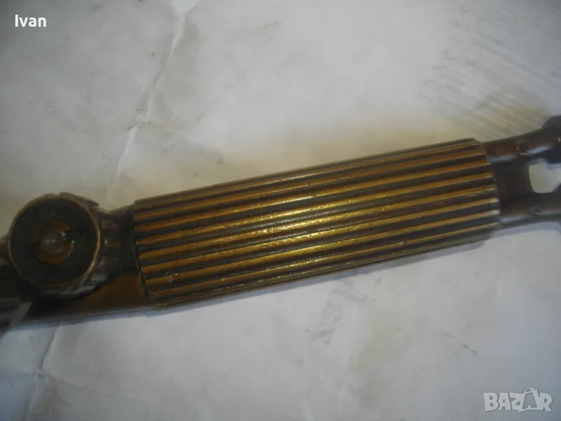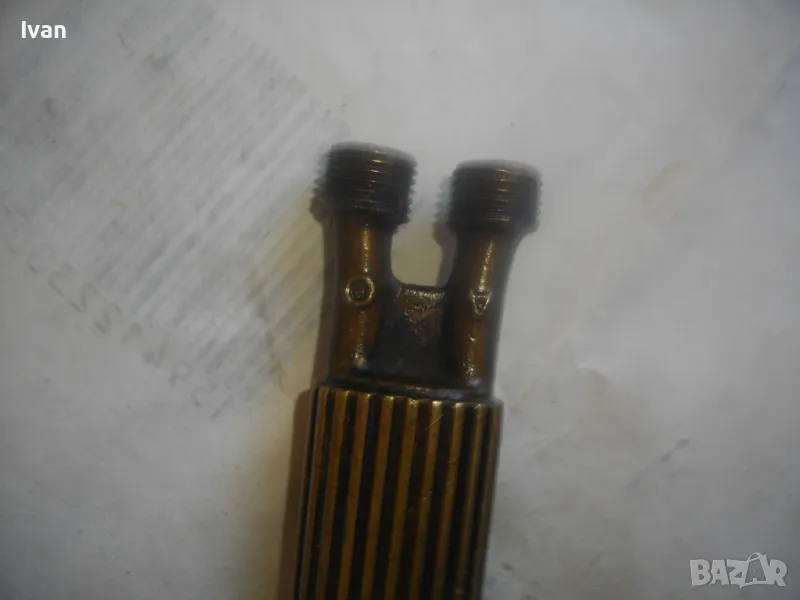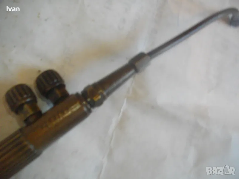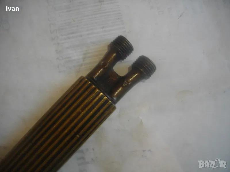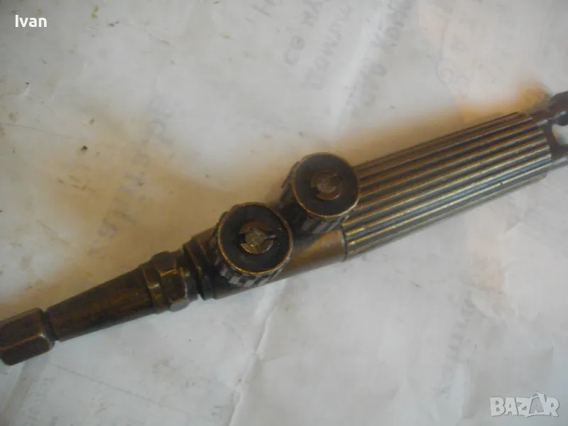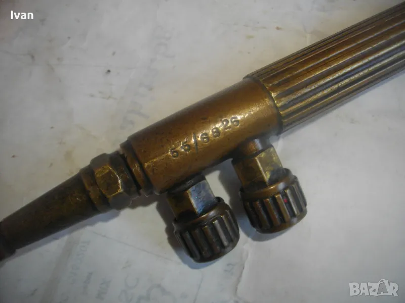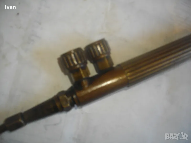ОПИСАНИЕ на бронзов изцяло с два въртока къс резак/горелка за оксижен - газо/кислородно рязане/запояване - цена 129 лв. Тип бижутерска - малка и удобна за работа. Изцяло всичко по нея от бронз. Предполагам немско или недерландско/холандско производство. Ползвана, в отлично техническо/работно състояние. Два извода отзад малък размер за присъединяване към маркучи - ф 12 мм. Два крана спирателни бронзови.Накрайник отпред малък размер ф 12 мм с 1 голяма дупка за пламъка по средата.Цялостна дължна на горелката - 34,5 см. Разполагам с други различни горелки/резаци за газ и за ксижен - нови и ползвани, различни дължини, с и без маркучи, с и без редуцир вентили, различни марки, на различни цени.