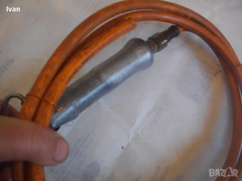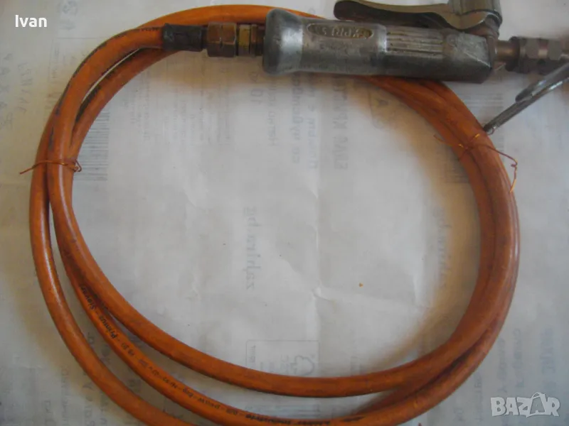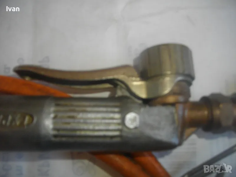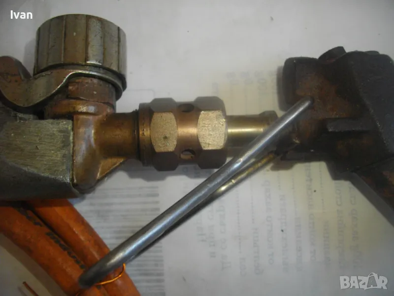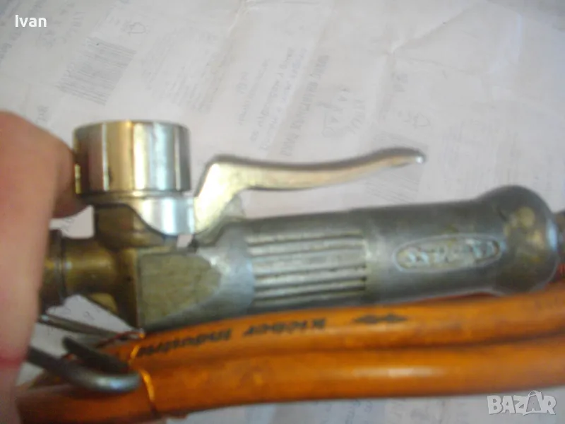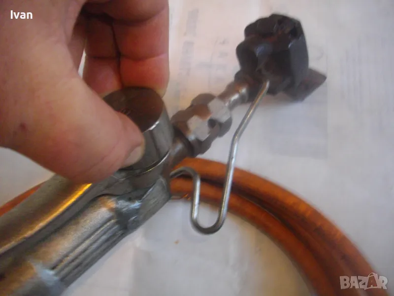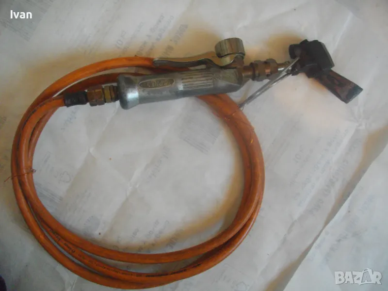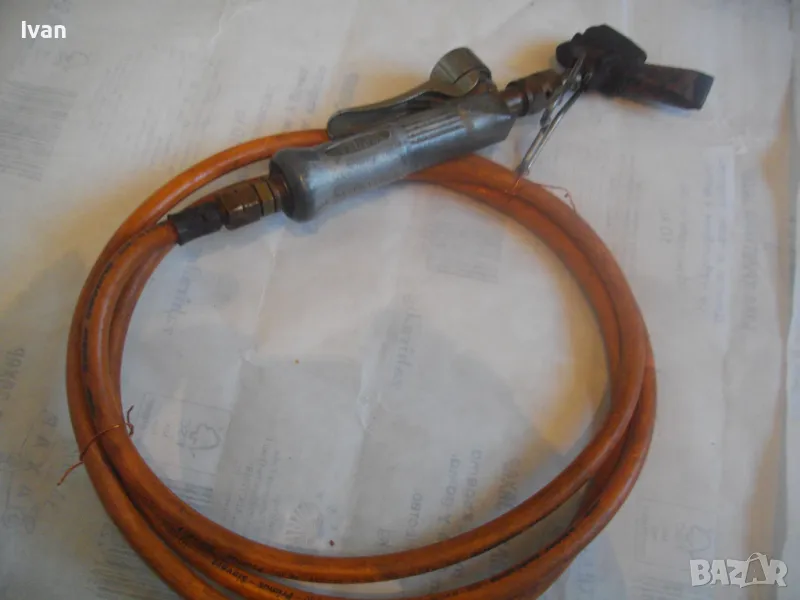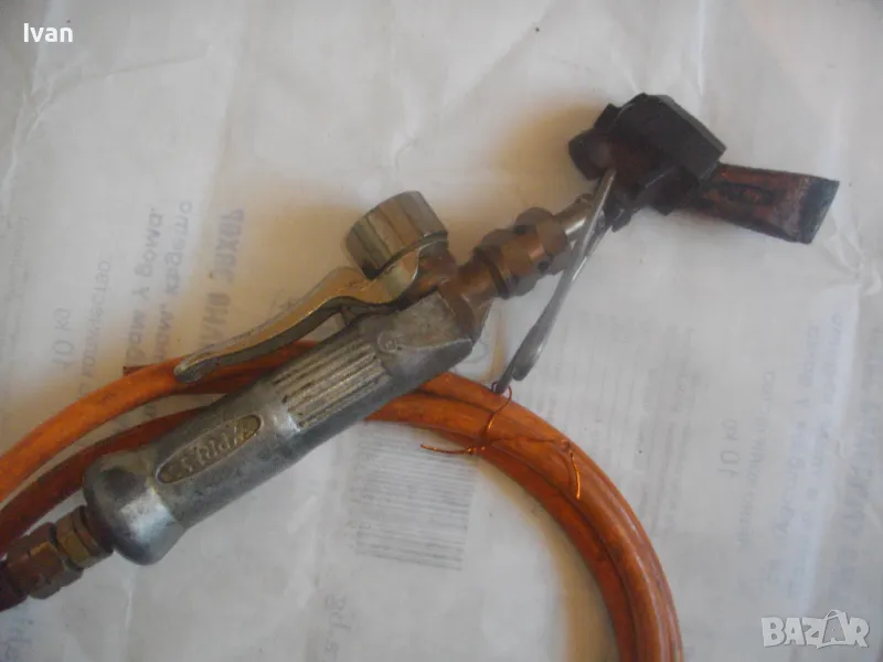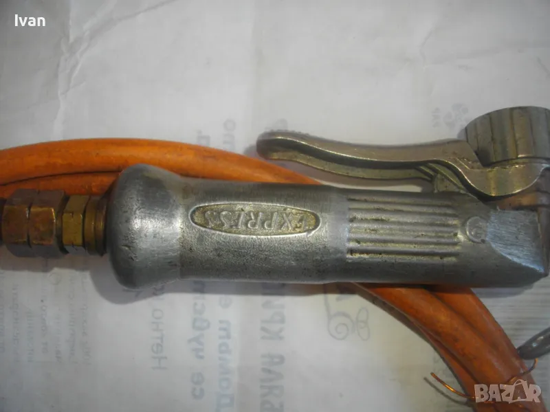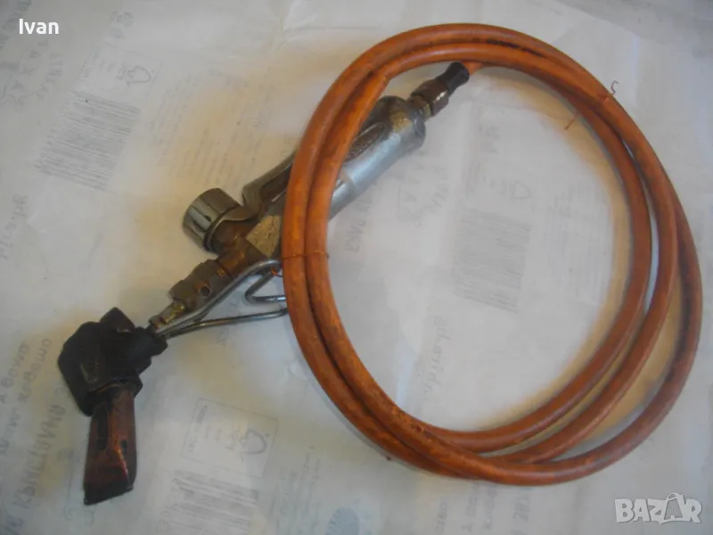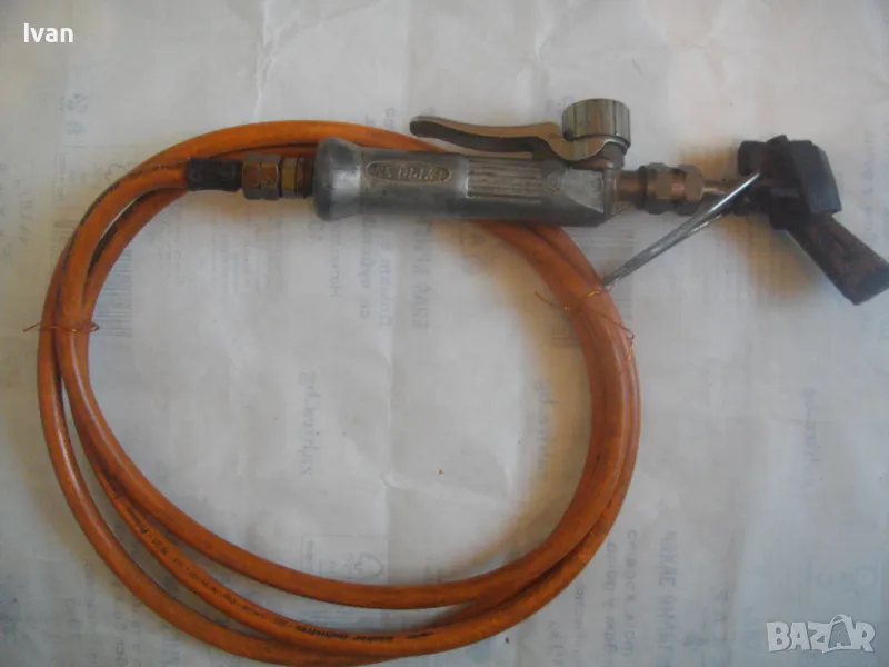 ОПИСАНИЕ на газов масивен поялник 280 мм за газ пропан-бутан - сив цвят, с маркуч 4 м и редуцир вентил оригинален. Със спусък и спирателен кран, метална вградена подпорна стойка за самостоятелен стоеж и редуцир вентил. Алуминиев. Немски или френски. Марка маркирана - EXPRESS. Сива, удобна алуминиева дръжка. с бронзово тяло и присъединителна бронзова глава за поялника. Спусък и спирателен кран - бронзови. Дължина на поялника - 280 мм. Човка поялника - масивна широка - 25 мм. Метална стойка за самостоятелен стоеж - вградена. Отлично техническо/работно състояние. Леко захабен външен вид /поляника е ползван при хидроизолации напокриви и има по него бегли следи от смолести инертни материали/. Масивен горен върток. Марка на медната човка - EXPRESS. Присъединен маркуч към поляника на щуцер резбови и метална стягаща маркуча скоба. Дължина на маркуча - 4 м. Тегло на поляник и маркуч - 2,5 кг.