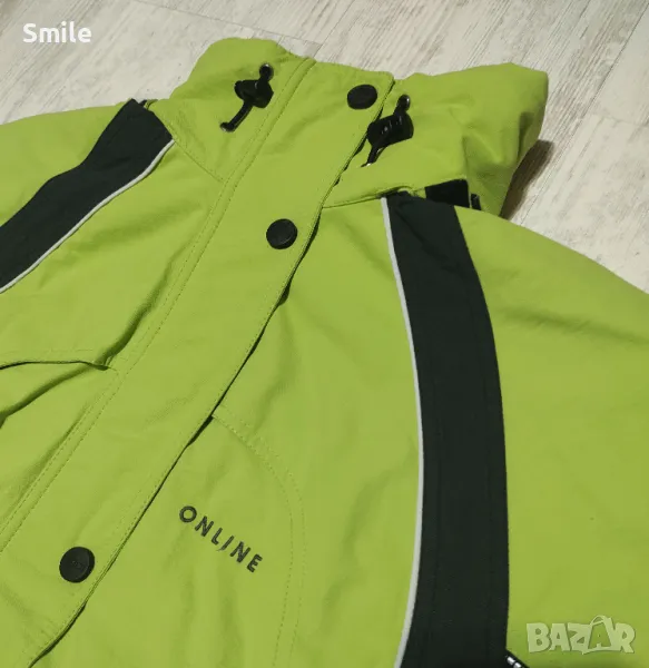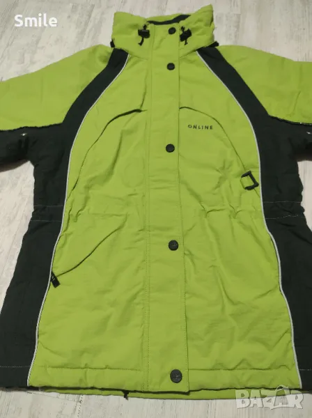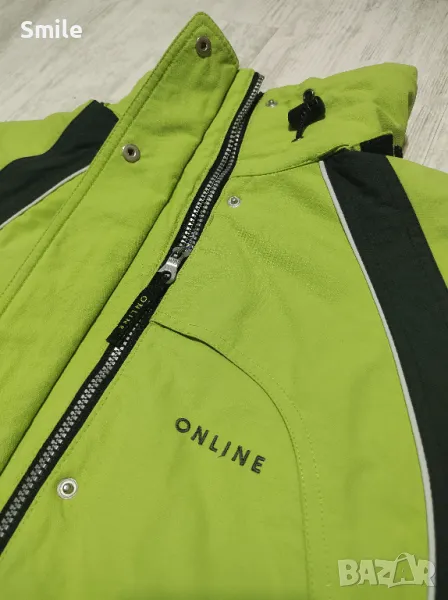 ONLINEi зимно яке, високо качество на материалите и изработката. Отлично състояние, без забележки. Топъл модел със система Aqua Max. Цветът е модерен светло зелен в комбинация с черно. Качулката липсва. Множество джобчета, маншети на ръкавите с велкро закопчаване, всички ципове работят. Отдолу е с връзки за регулиране със стопери. Размер 38. Размери измерени от мен: ширина от подмишниците - 57 см., дължина - 70 см., дължина ръкав от подмишницата - 50 см., дължина на ръкав + рамо - 74 см.. Изпращам със "Спиди" или "Еконт