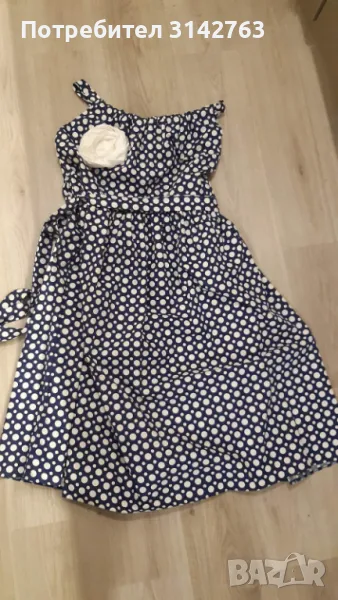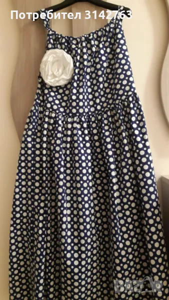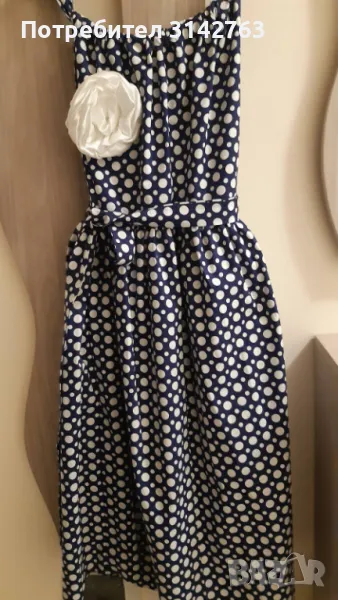 Нова рокля , 100% фин памук, регулиращи се презрамки. Цвете 3D, което може да се сваля. Роклята има колан от плата, но може да се носи и свободно. Тъмно синя на бели точки.