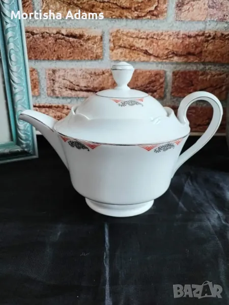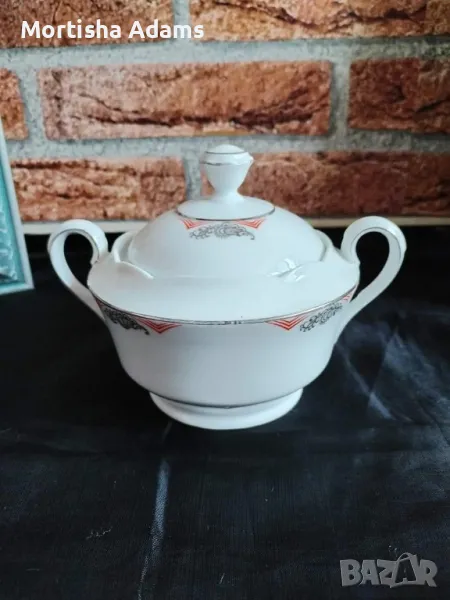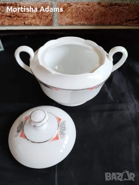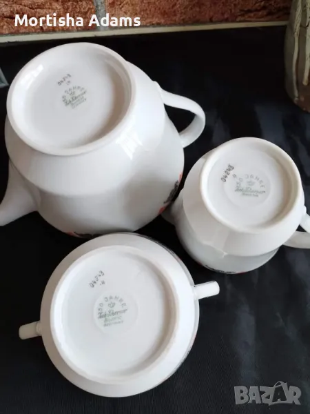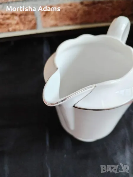 Разкошно трио от фин, бял порцелан с платинен кант и семпла, но елегантна декорация. Съдовете са здрави, несъвършенства на каната в някои участъци.