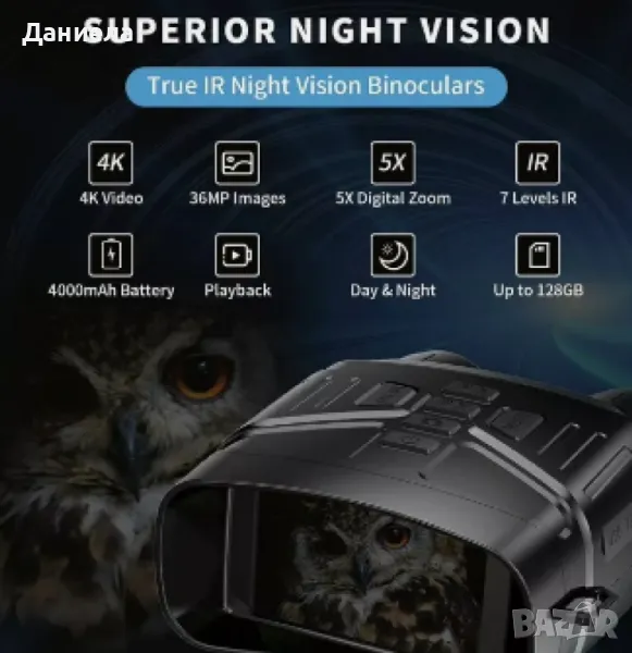 Тип продукт : Бинокъл;Бинокълът с 4K нощно виждане е мощно устройство за наблюдение при всякакви светлинни условия. Оборудван с висока резолюция от 36MP за ясни снимки и видеа, той разполага и с възможност за запис в 4K формат. Презареждаема литиева батерия за дълготрайна употреба. Този бинокъл е идеален за лов, къмпинг, нощно наблюдение и други outdoor активности.Гаранция 12 месеца.