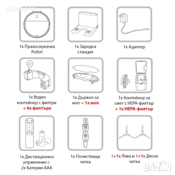 Безчетков мотор с 4 нива на всмукателна мощност: ECO: 600 Pa Стандартно: 1000 Pa Турбо: 2000 Pa Макс.: 2700 Pa;Работа: 1400 об./ мин.Батерия: Литиево-йонна 2600mAh;Контейнер за прах: 340 мл.;Резервоар за вода: 250 мл.;Време за зареждане/ работа - ~ 250/ 140 мин.Wi-Fi отдалечен контрол чрез приложението TuyaSmart;Дистанционно управление с 4 режима на почистване: Автоматично,Случайно,Почистване на ъгли,Ръчно почистване;Функция „Събуждане“ Почистване по график;Преодолява препятствия с до 15 мм. височина;Размери: Φ320мм., височина 75 мм.;Скорост: 30 см.;Ниво на шум - ≤70 dB (A);Сензори: Против падане и против сблъсък;Аксесоари: 2 x лява и дясна странични четки, 2 x HEPA филтри и 2 x мопа;Гласов контрол чрез Amazon Alexa и Google Assistant;Гаранция: 24 месеца.
