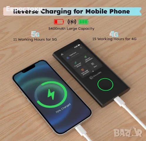 Преносим и удобен за потребителя. Безжичният мобилен 5G WiFi рутер е оборудван с голям 2,4-инчов LCD сензорен екран, който осигурява удобен достъп за наблюдение на използването на данни, силата на сигнала, свързаните устройства, мрежовите настройки и т.н. Лесно е да управлявате и споделяте вашата гореща точка с до 16 устройства едновременно и се удвоява като захранваща банка, за да поддържа всичките ви устройства заредени в движение.