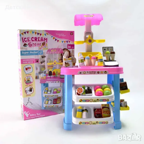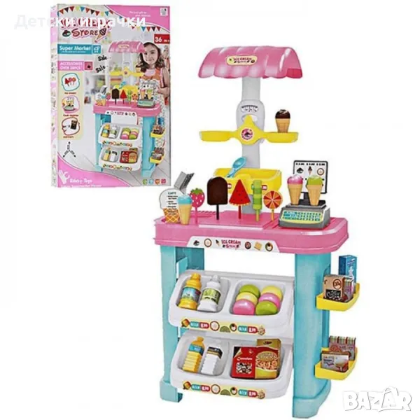 Има фискален касов апарат и баркод четец, който работи на батерии, свети и издава звук, все едно наистина тиктака маркирайки продуктите.