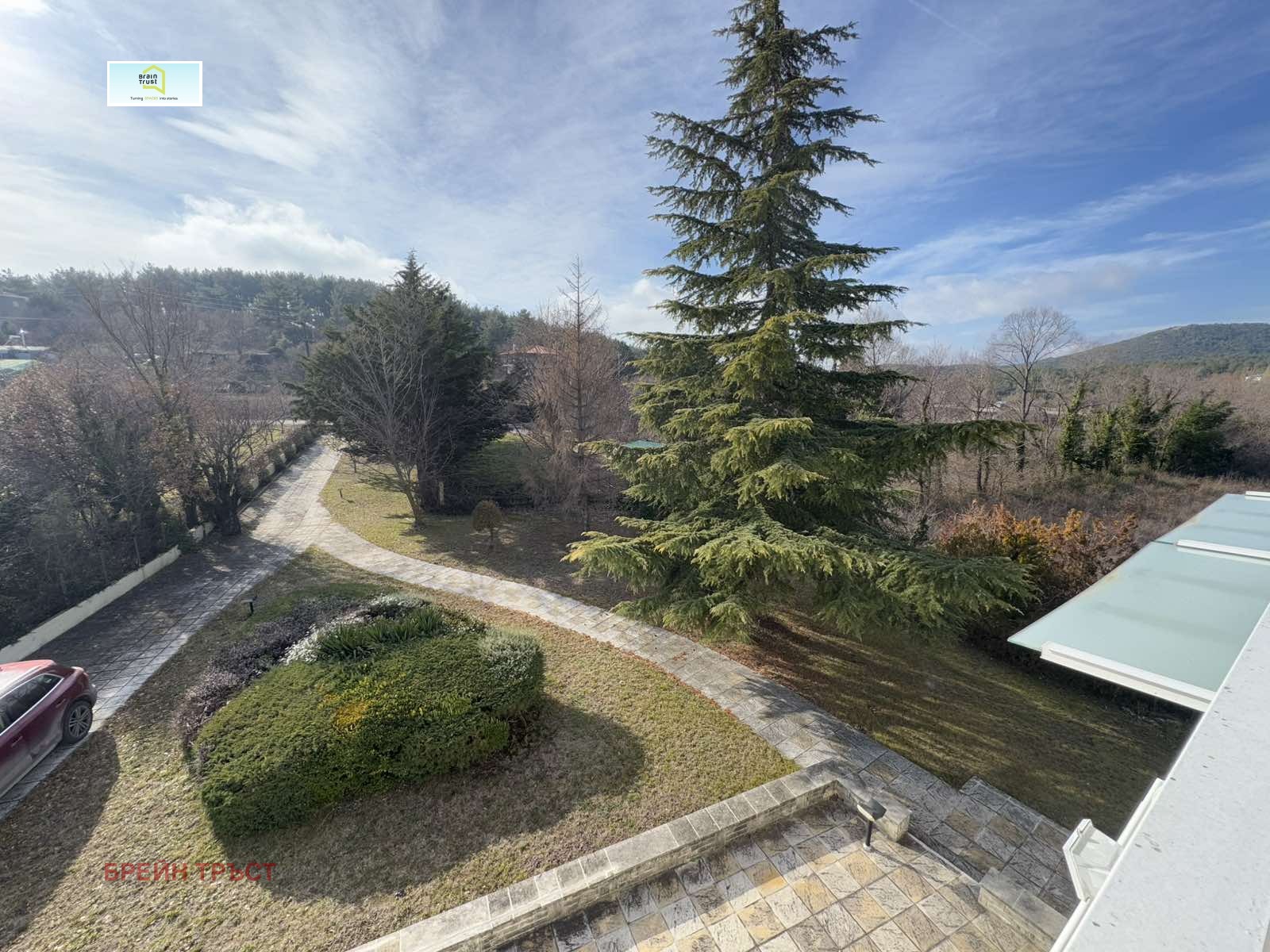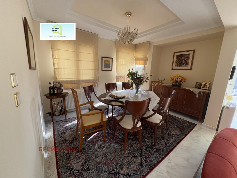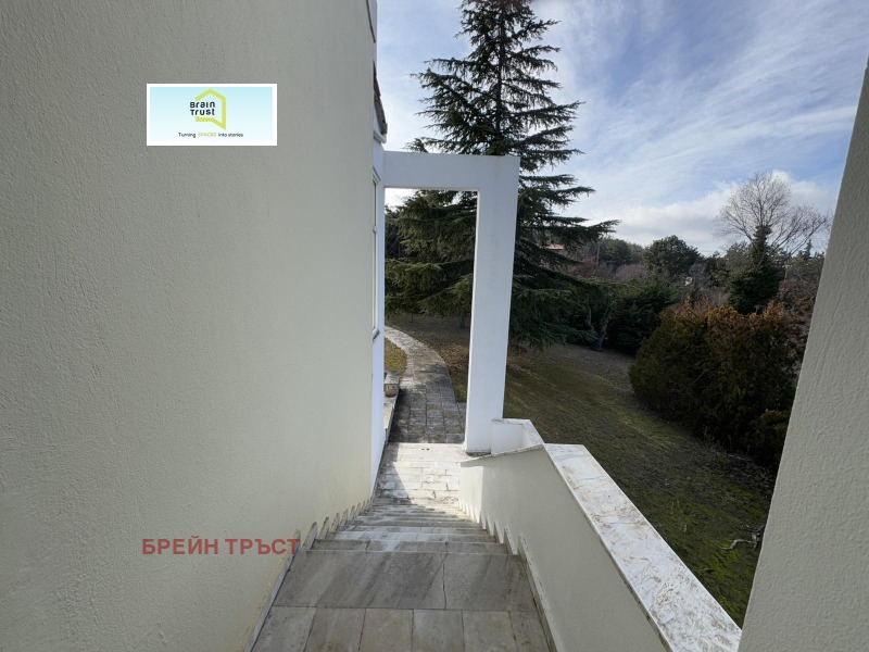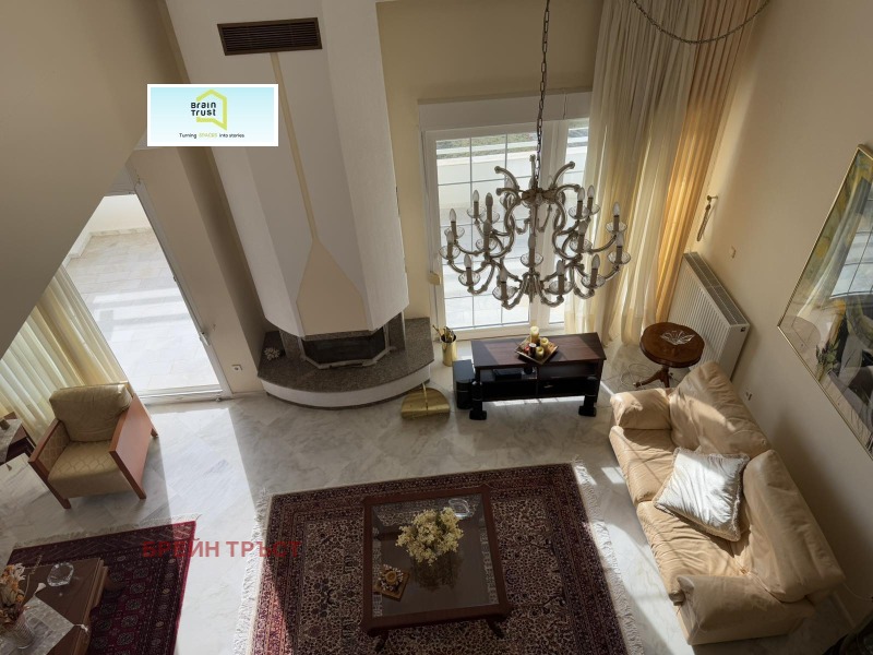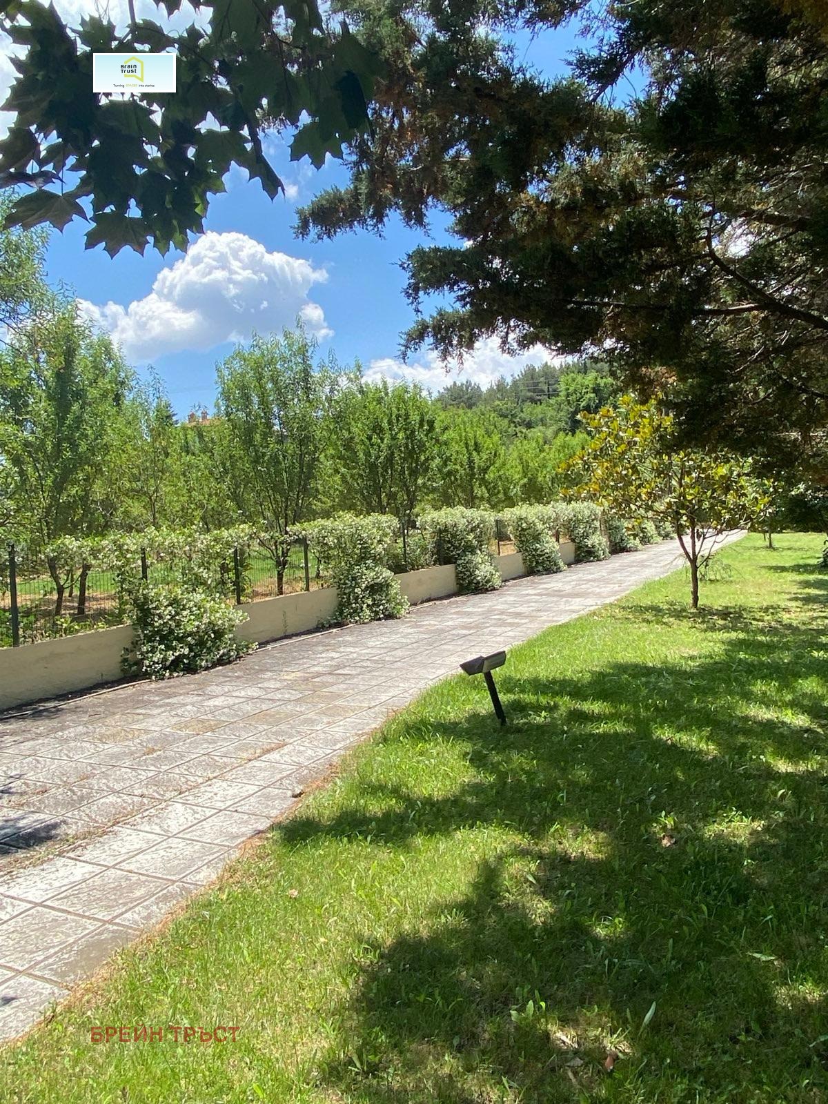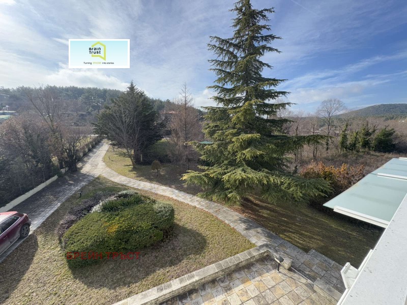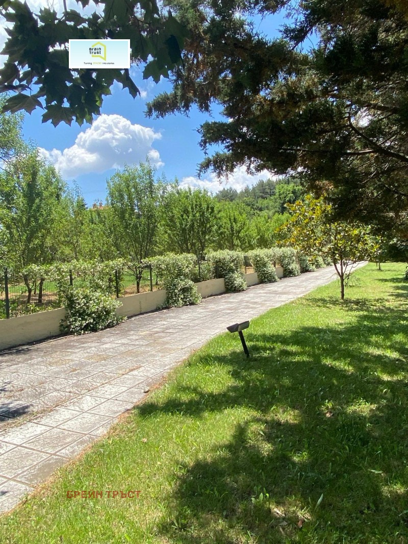 Имотът се намира в красив двор, със зелена площ с различни декоративни растения, с площ от 2000кв.м., а къщата е с площ от 315 кв.м. и се състои от 5 спални, 3 всекидневни, 2 кухни, 3 бани, покрит гараж за две коли и различни складови помещения.