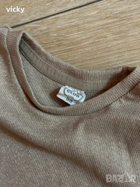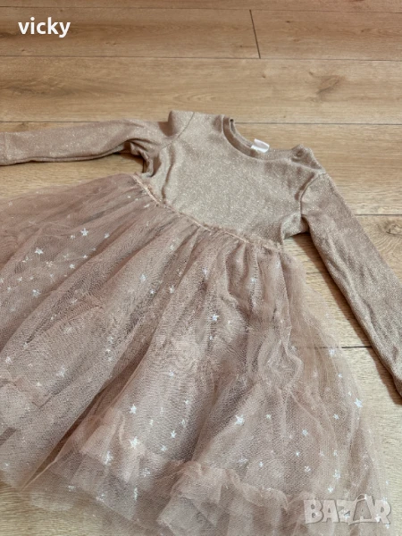 Приказна блестяща рокличка. Размер 98 по етикет. Изключително приятна на допир материя, със златна нишка и блестящи звездички по тюлената част. Тюлът има подплата. Рокличката е истинско бижу! Обличана е само и единствено веднъж, за коледна фотосесия, за няколко минутки. Без забележки, като нова! Затова и посочвам това състояние в описанието! Изпрана и дезинфекцирана.
