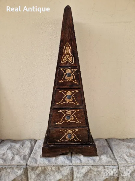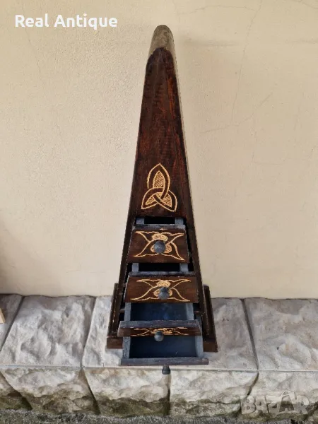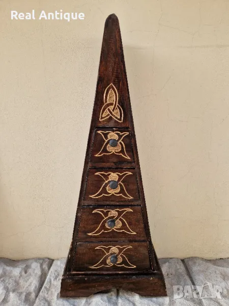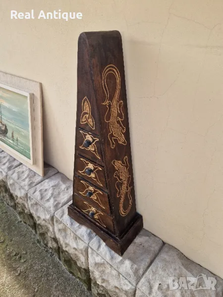 Продавам чудесно антикварно шкафче тип пирамида с 4 чекмеджета в много добро състояние ръчно изработено и изрисувано. Размери височина 80 см ширина в долната част 33 см. Прекрасно допълнение към интериора на Вашия дом офис вила ресторант хотел. Работя с всички куриери. Отговарям бързо.