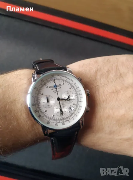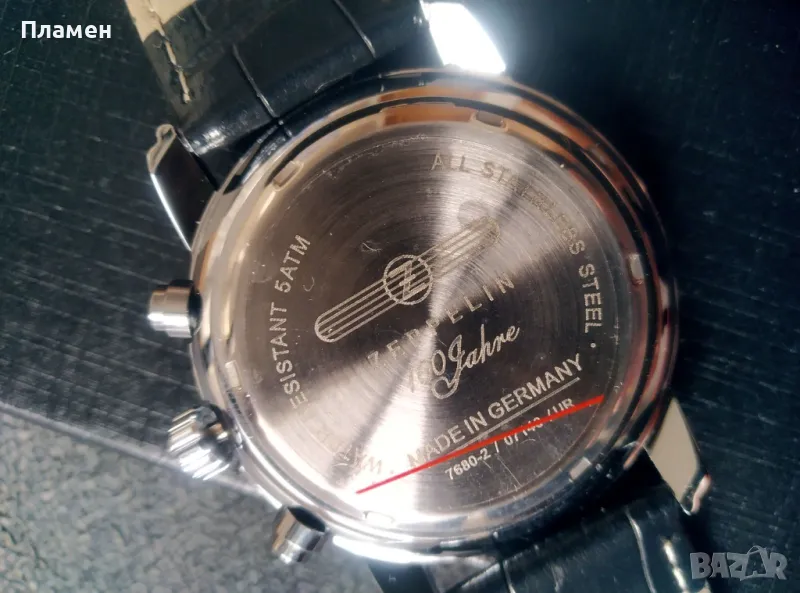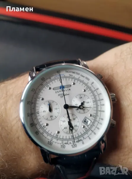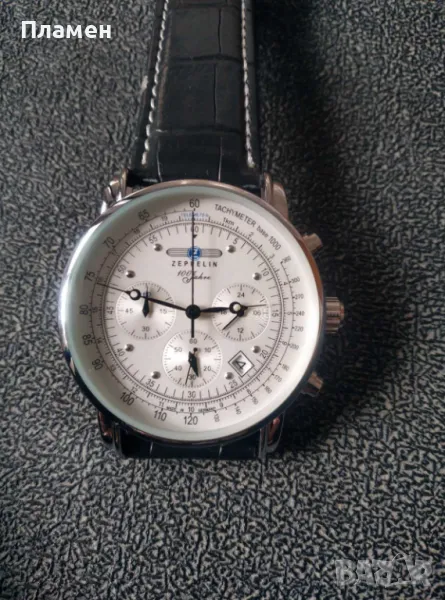 Авиационният часовник Zeppelin 100 Jahre Chronograph 7680-2 е пуснат в лимитирана серия, за да отбележи стогодишнината на известната авиокомпания Zeppelin. Този юбилеен мъжки модел е издържан в черни цветове със сребърни акценти. Белият циферблат се отличава с детайлни и фино градуирани индекси с обширни функции. Те включват двойно време, тахиметър, секундна стрелка, аналогова дата на деня от месеца и циферблат, на който отбелязваме часа за да ни напомня за важни въпроси. Циферблатът е покрит със сапфирено стъкло, устойчиво на надраскване и издраскване. Всичко е затворено в корпус от стомана в сребрист цвят и окачено на черна кожена каишка. Водоустойчивостта на часовника от 50 м му позволява да се справя с вода и леки пръски. Това е стилен и успешен модел, който винаги ще бъде модерен благодарение на сантименталния си характер в модерни цветове. Повече информация ZEPPELIN 7680-2