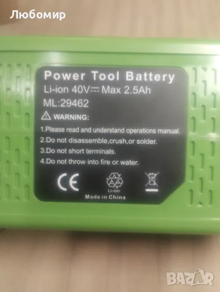Тази батерия е съвместима с батерии Greenworks 40V GMAX 20302, 20672, 24252, 20202, 22262, 20322, 25312, 25302, 25302, 25322 безжични инструменти 2102, 22272, 27062, 21242, 24282, 21332, 21362, 22342, 2500502, съвместими със зарядни устройства Greenworks 40V