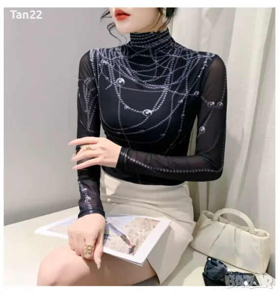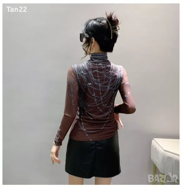 Нова уникална поло блузка с прекрасен акцент отпред и на гърба ,с тюлени ръкави ,в тъмнокафяв цвят