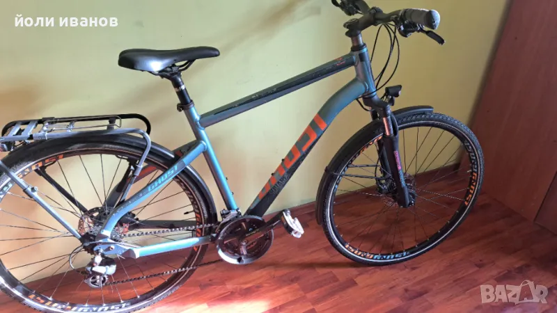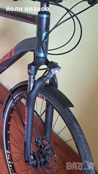 Градски велосипед 28 цола,24 скорости,дискови хидравлични спирачки,амортисьорна вилка,динамо главина,лед фар,много здрав багажник алуминиев с квадратен профил,алуминиево колче за седалката ф 31.6мм,алуминиево кормило,лапа,команди палцови на шимано,дерайльор на шимано Асера,стойка за велосипеда,предпазител на средното движение,скрити жила в рамката отдолу в канал,всичко по велосипеда работи
