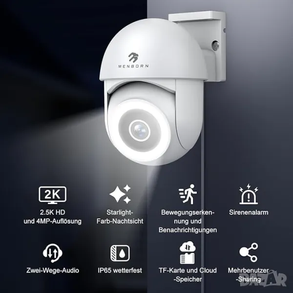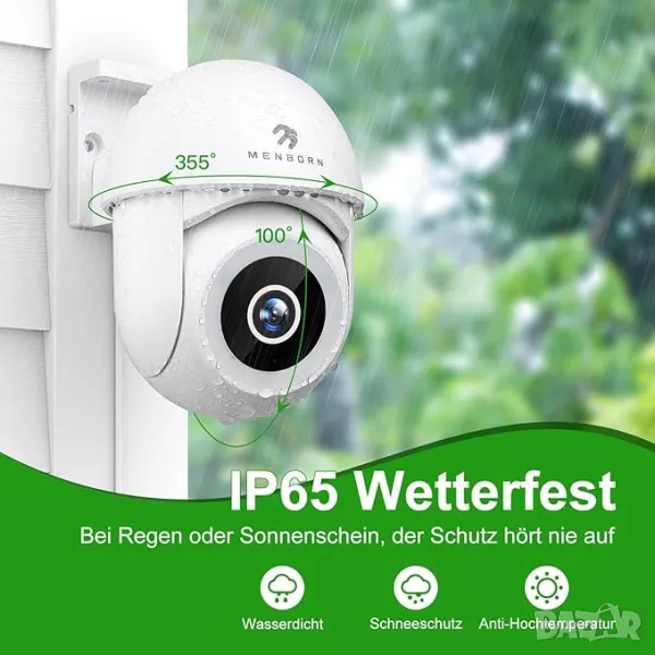 Камерата за външно наблюдение Menborn е проектирана със 100 градуса вертикално и 355 градуса хоризонтално въртене. Можете да управлявате камерата за наблюдение от разстояние, за да я наблюдавате навсякъде без слепи зони. Външната IP камера е оборудвана с корпус, устойчив на атмосферни влияния IP65, който напълно предотвратява проникването на прах и пръски и е подходящ за всякакви лоши метеорологични условия.