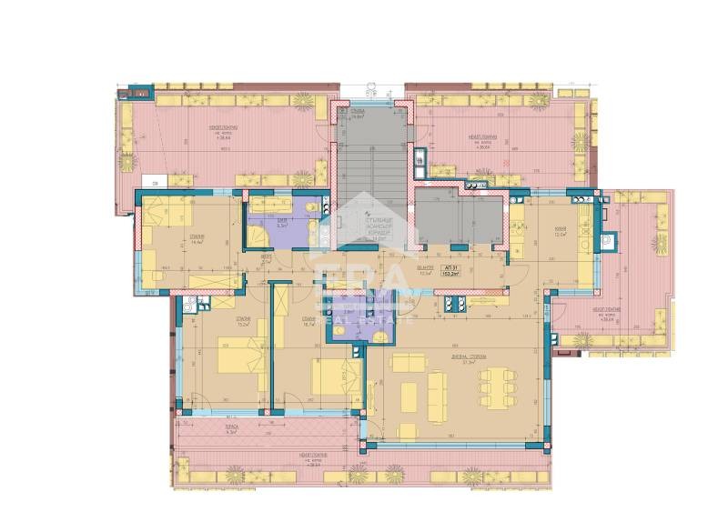 Разпределение: Голямо входно антре с директен достъп от асансьор, дневна с кухненски бокс и трапезария 50 кв. м., коридор към 3 спални, 2 бани с тоалетна и просторни тераси с изключителна гледка, с поглед към града и планините.