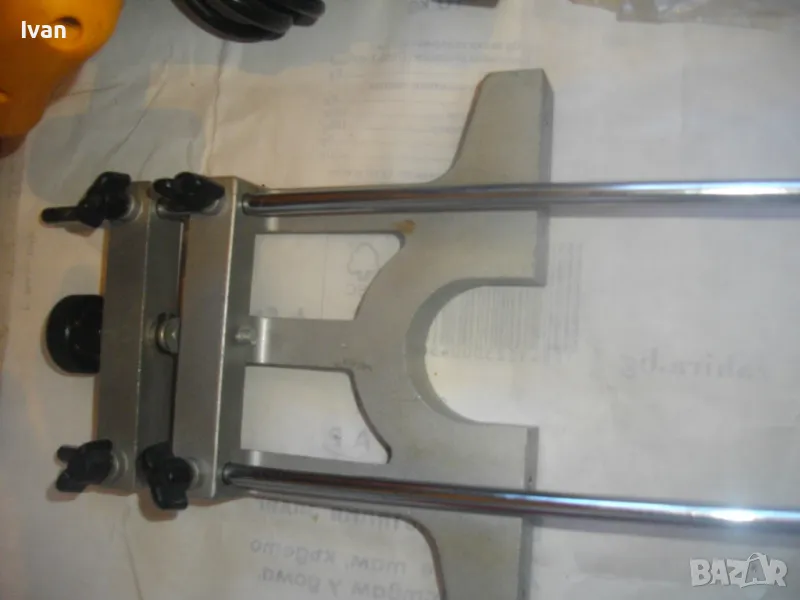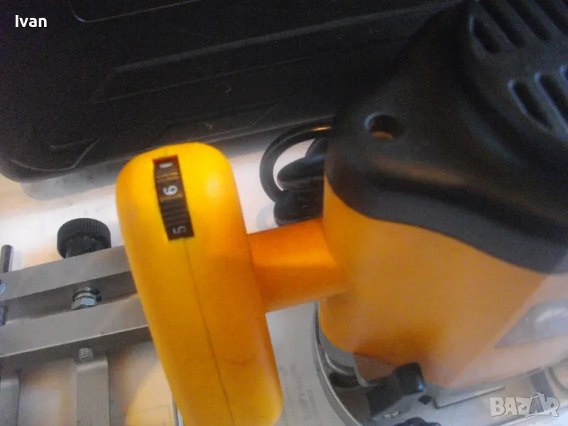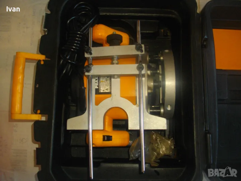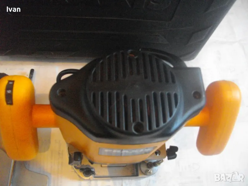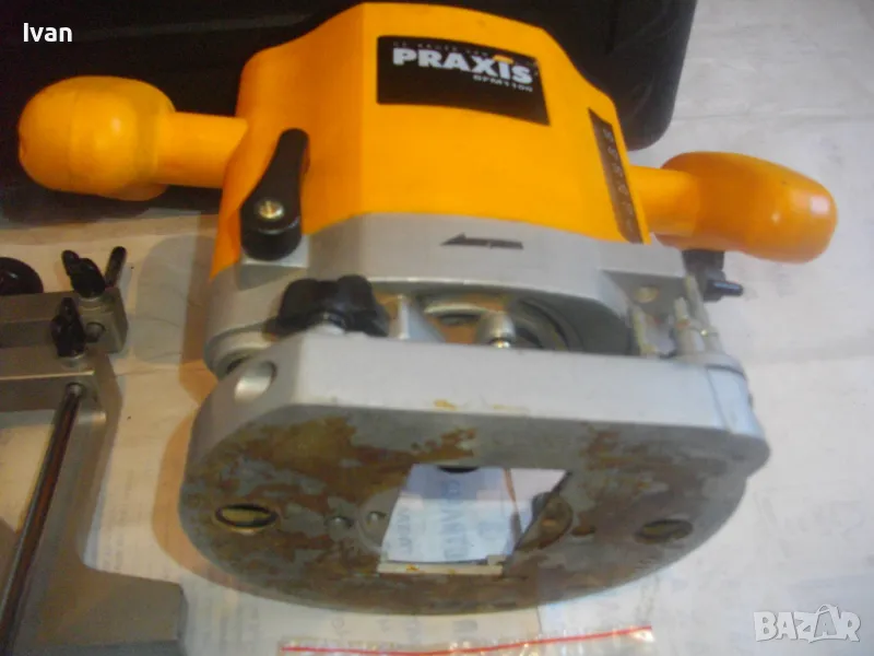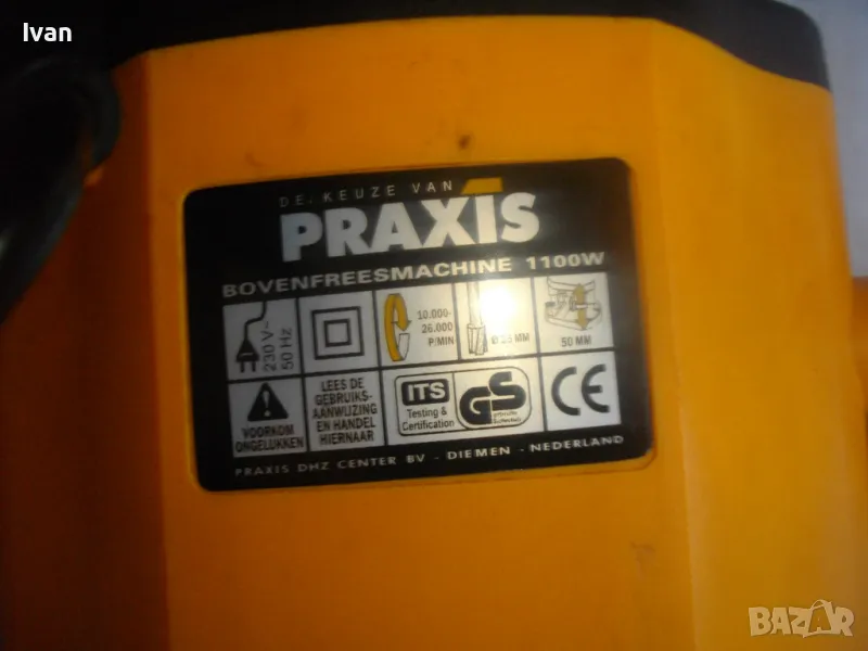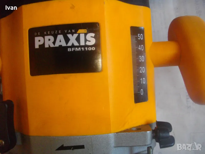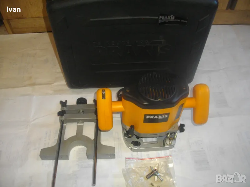 ОПИСАНИЕ на жълта професионална оберфреза нидерландска - в куфар, с оригинален водач - цена 199 лв. Холандска професионална оберфреза на Праксис с ход 50мм и възможност за работа с фрезер ф 35 мм, упоменато на маркировките.Марка и модел на машината -PRAXIS BFM 1100.Производство - оригинално Холандия - Nederland- упоменато на маркировките. ФРЕЗАТА Е БЕЗ ЦАНГА И БЕЗ ГАЙКА ПРИТЯГАЩА НА ЦАНГАТА.