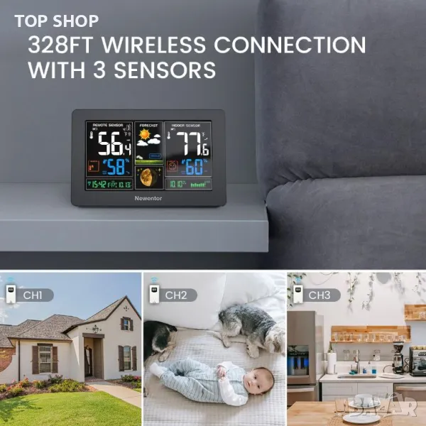 [Домашни метеорологични станции с 3 дистанционни сензора] Безжична станция за прогнозиране на температурата поддържа до 3 дистанционни сензора за откриване на множество места като бебешка стая, складово помещение, винарска изба, навес за зеленчуци и др.
