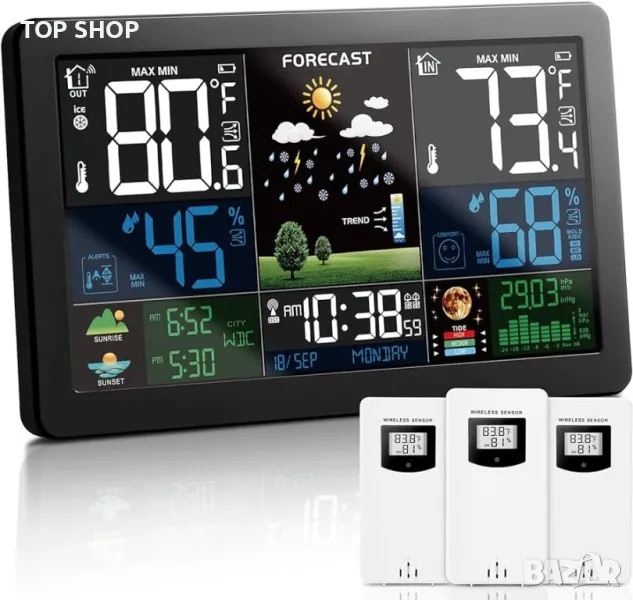 Безжичен вътрешен външен термометър с 3 дистанционни сензора, 7,5-инчов цветен цифров метеорологичен термометър с атомен часовник, температура/влажност/барометър/станция за прогнозиране, черен