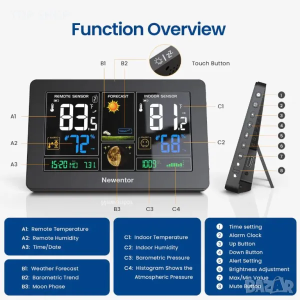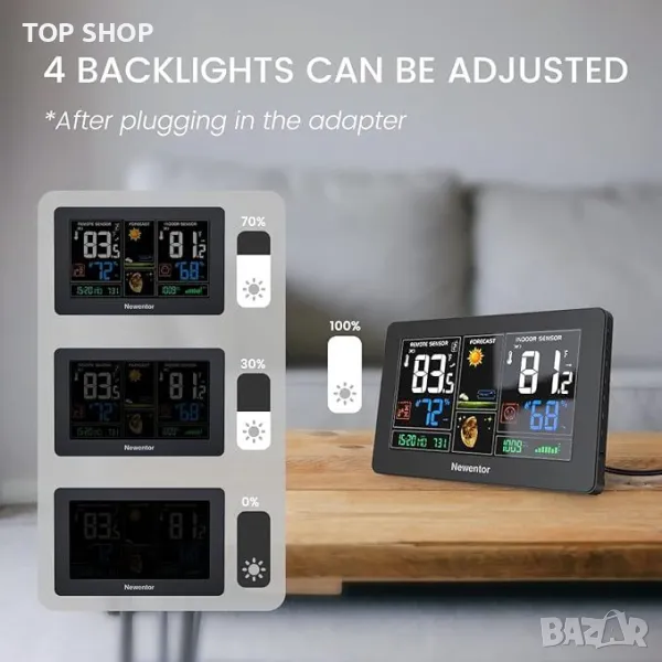 [7,5" метеорологични станции с LCD екран] Монитор за температура и влажност на Newentor с голям цветен дисплей, който показва изчерпателна информация: влажност на вътрешната външна температура (макс./мин., хай/ниско), персонализирани сигнали, час/дата, будилник/дрямка, прогноза за времето ( следващите 8-24 часа) лунна фаза, барометрично налягане.