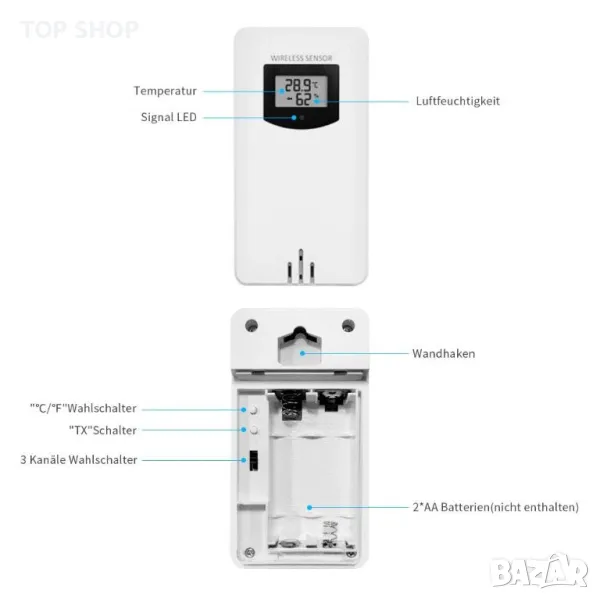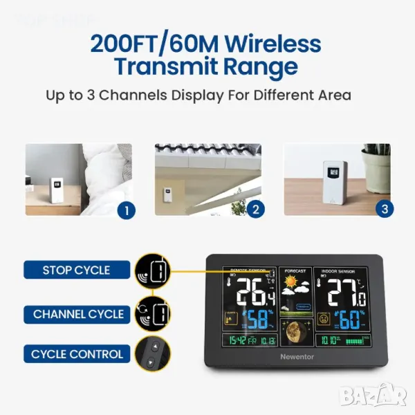 [3-канални домашни метеорологични станции, безжични вътрешни и външни] Безжична станция за прогнозиране на температурата поддържа до 3 дистанционни сензора за наблюдение на вътрешна външна температура и влажност на множество места. Пакетът съдържа един дистанционен сензор.