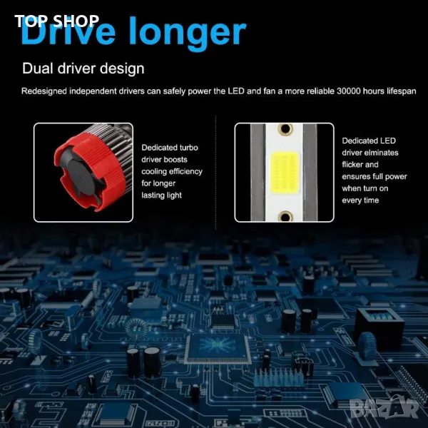 【Перфектно разсейване на топлината】 Уникалният дизайн на вентилатора с двоен сачмен лагер, комбиниран с 12 000 оборота в минута и двоен сгъваем радиатор с медно ядро, гарантира максимално разсейване на топлината и кара нашите фарове да светят до 30 000 часа. IP67 водоустойчив драйвер и конектори. Перфектно представяне при лошо време, като мъгла/дъжд/облачно време и др.