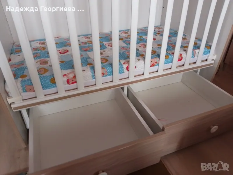 Чисто нова кошара, заедно със матрака. Светъл дъб с бяло е комбинацията от цветове. Две чекмеджета на релси с механизми за плавно затваряне. Кошарата има механизъм люлка, нивото на матрака може да е на две нива. По високо когато бебето е малко на месеци и после като порасне съответно по долу. Решетката също може да бъде на две нива и съответно да се махне напълно като стане детето по голямо.