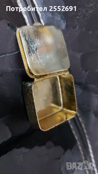 Метална кутия с позлата и инкрустации. Капачето е с ръчно изработена мозайка от минерали. Размери-3/3/1,7см. Наличие на надпис ITALIA.