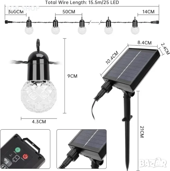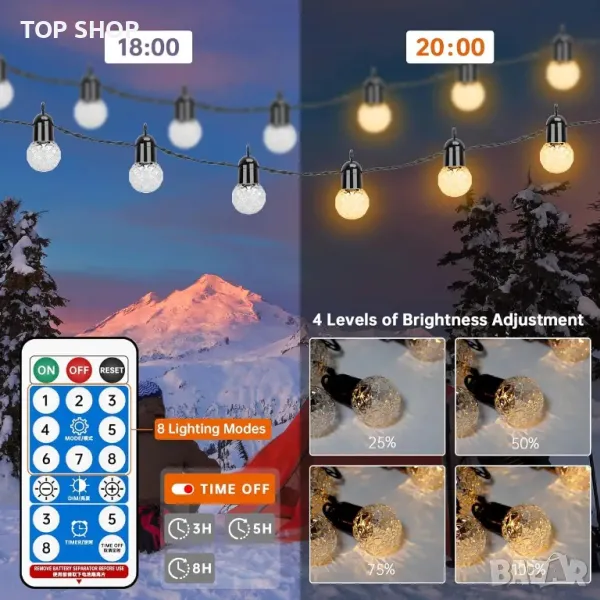 ★ 8 режима и 4 яркости ★ Външните светлини G40 имат 8 различни режима и 3/5/8 часов таймер и 4 регулируеми нива на яркост. Можете да промените режима, яркостта и времето според вашите нужди.