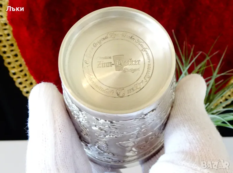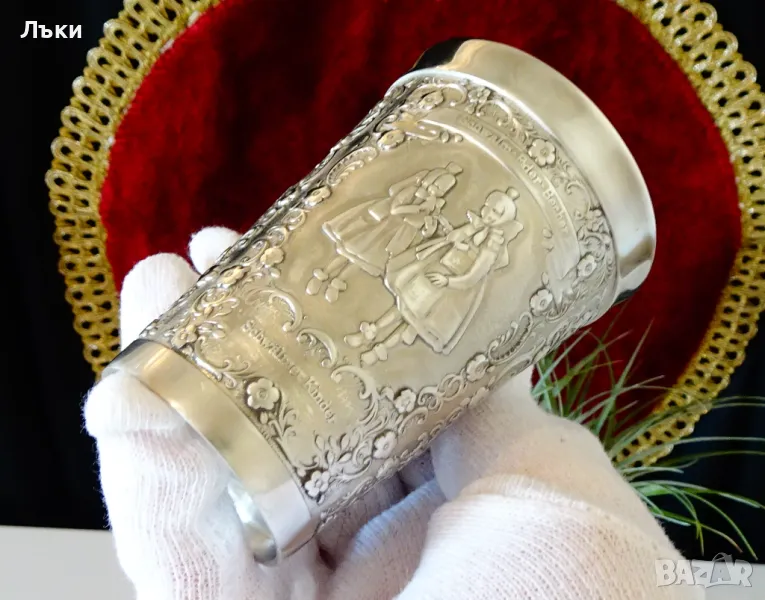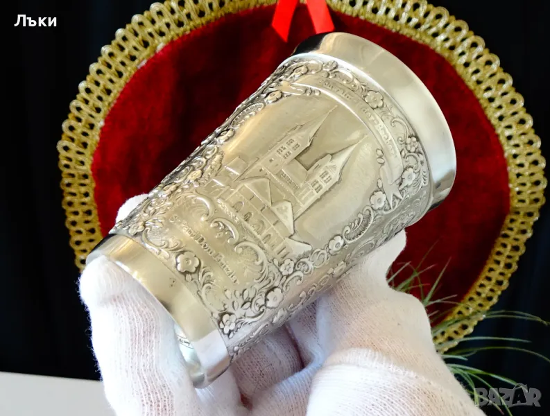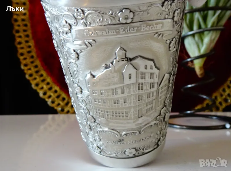 85% калай и 15% сребро,маркирана от производителя в Щутгард.Декорирана с релефно гравирани изображения на Църква и Катедрала в района на Schwalm по