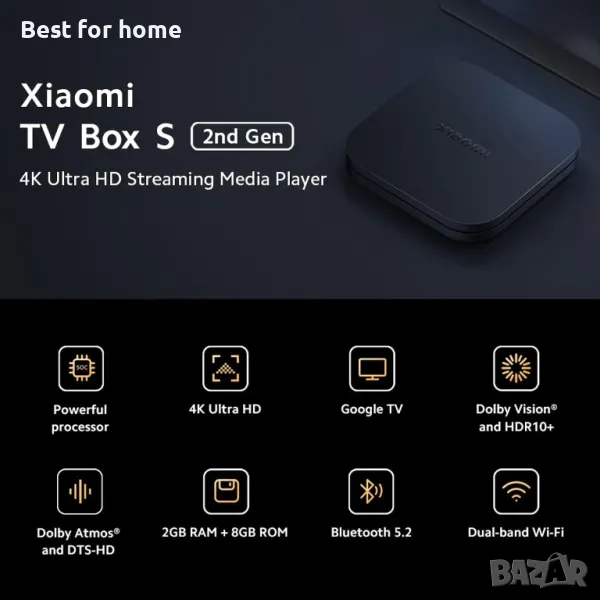 Подобрете вашето развлекателно изживяване с Xiaomi TV Box S (2-ро поколение), мощен 4K Ultra HD стрийминг медиен плейър, който предоставя зашеметяващи визуализации и завладяващ звук. Насладете се на кристално чисти изображения с технологията Dolby Vision и HDR10+, докато Dolby Atmos и DTS-HD съраунд звук създават кинематографична атмосфера във вашата всекидневна. Осъществено от четириядрен процесор и 2 GB RAM, тази кутия на Google TV предлага безпроблемна производителност за стрийминг, игри и многозадачност. С вградения Google Assistant и 360° Bluetooth дистанционно можете лесно да управлявате вашето съдържание и интелигентни домашни устройства само с гласа си.