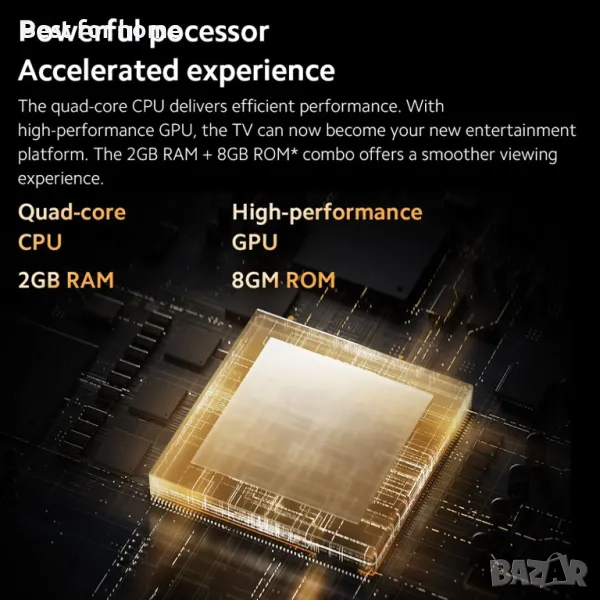 Четириядреният процесор осигурява ефективна работа. Благодарение на високоефективния графичен процесор телевизорът се превръща във вашата нова платформа за забавления. Съчетанието на 2 GB RAM + 8 GB ROM* предлага по-гладко визуално изживяване.