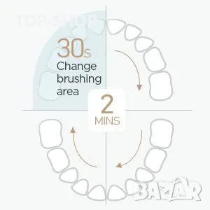 Вграден 2-минутен интелигентен таймер с периодични паузи, който ви напомня да сменяте зоната на четкане на всеки 30 секунди, за да насърчите здравословния навик за четкане. Изключва се автоматично след две минути.