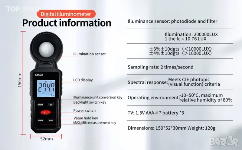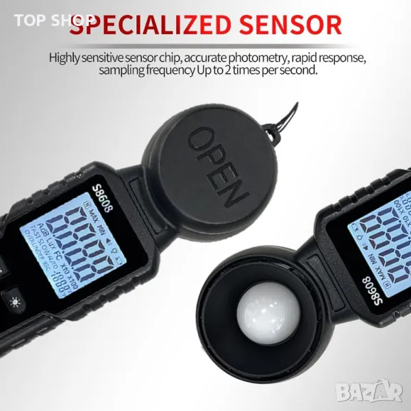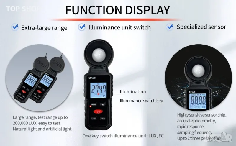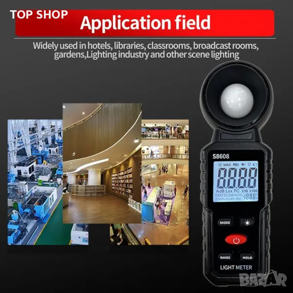 S8608 is a digital illuminometer, used for measuring visible brightness, large screen display, wide measuring range, up to 200000LUX, automatic conversion range. Can be widely used in such as schools, hospitals,factories, airports, families and other occasions of brightness measurement.