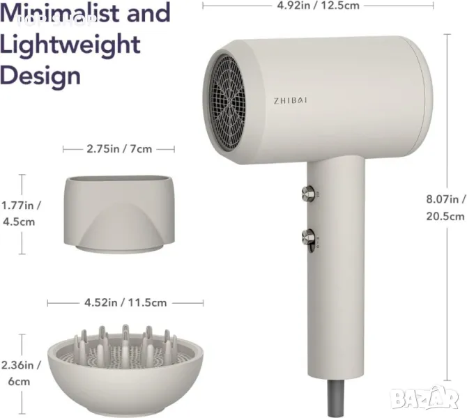 професионален сешоар ZHIBAI с йони,2 температурни режима, 1 дифузер и 1 накрайник за стилизиране,