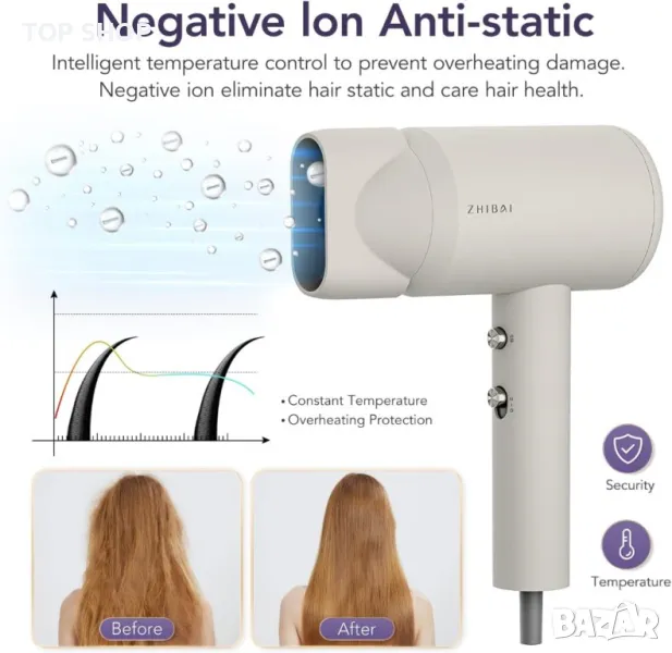 Сешоар ZHIBAI с йони, професионален сешоар с 2 температурни режима, 1 дифузер и 1 накрайник за стилизиране, сешоар с отрицателни йони