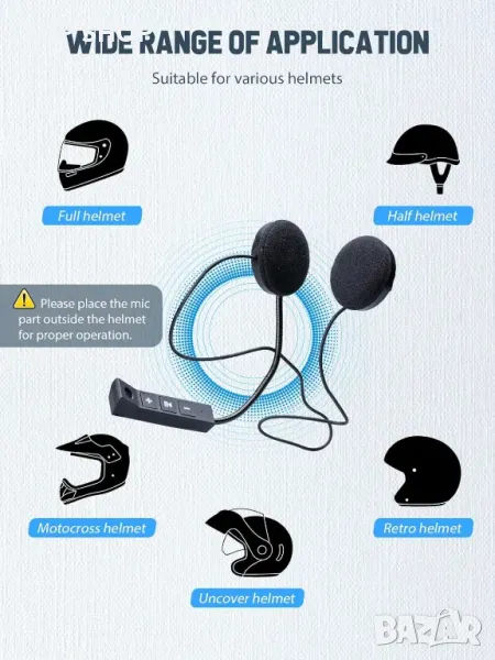 【Широка съвместимост】Тази мотоциклетна комуникационна система се прилага с устройства с iOS и Android и работи с повечето каски с отворено лице, модулен и пълен тип каски, идеални за каране на мотоциклет, ски, катерене и други дейности на открито